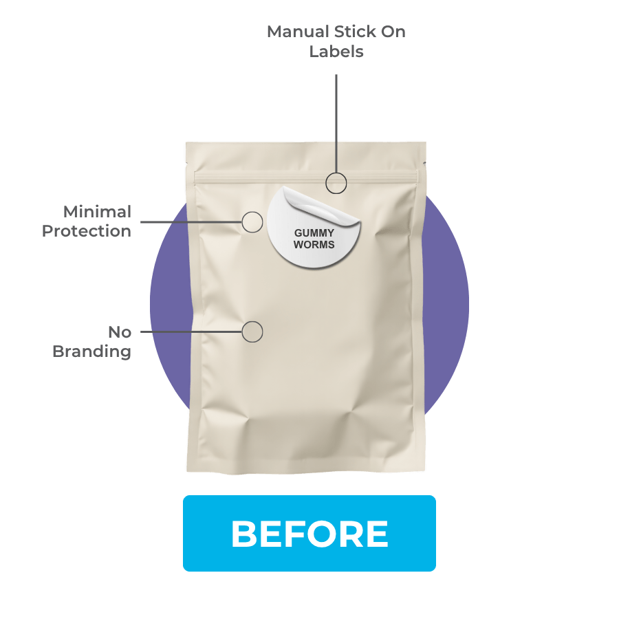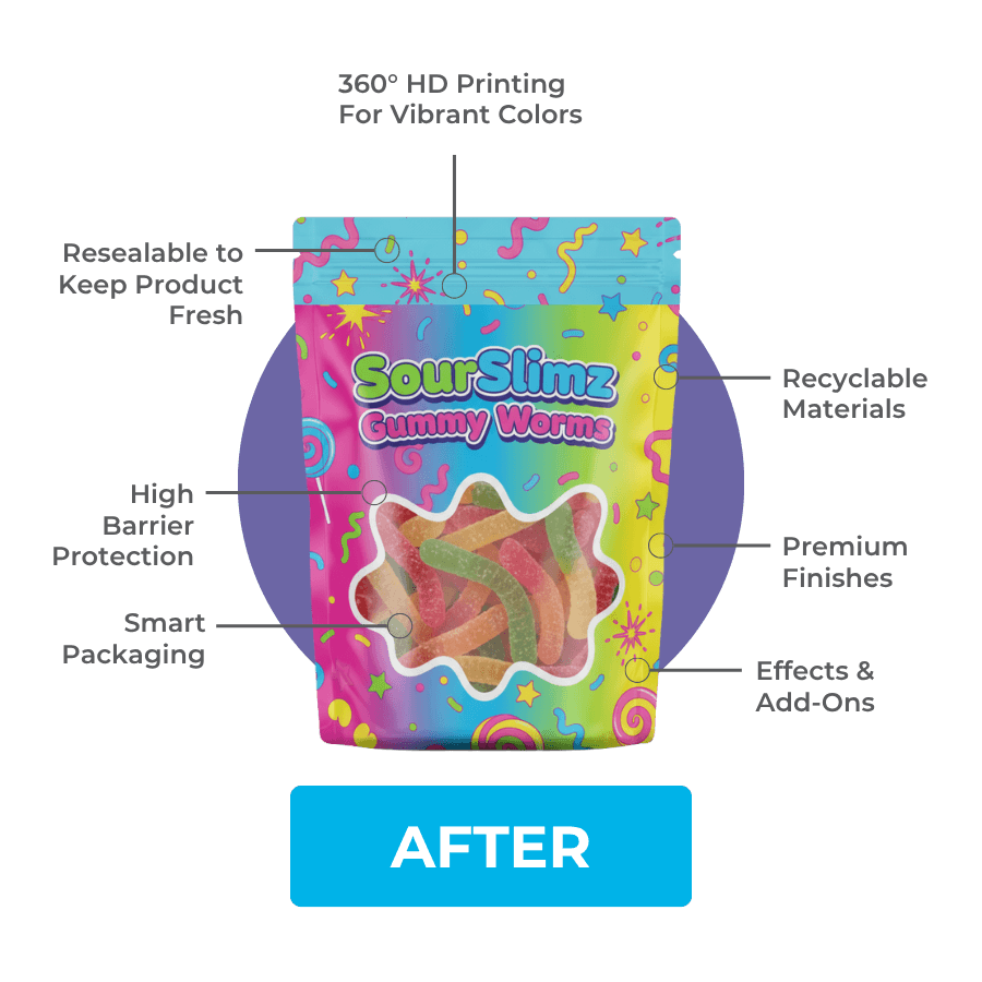 With custom printed flexible packaging, there is plenty of real estate available to tell your brand story, including the full front, back, and side panels of stand up pouches, and the front and back of lay flat pouches or pillow pouches.
