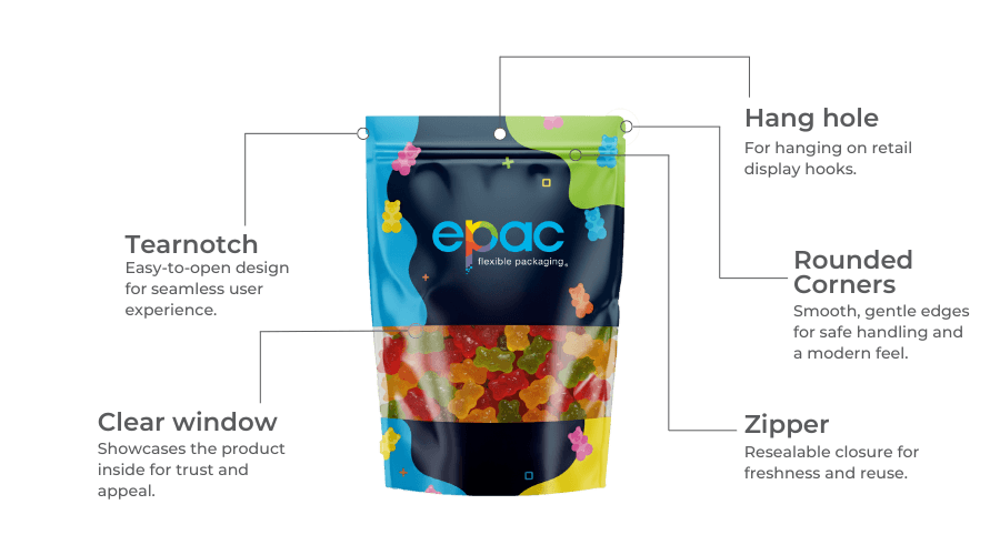 Versatile, resealable format perfect for chocolates, gummies, and bite-sized candies.